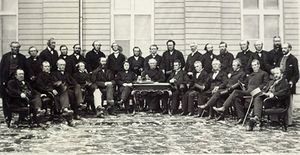 As his government had fallen again, Macdonald approached the new governor general, Lord Monck, and obtained a dissolution. Before he could act on it, he was approached by Brown through intermediaries; the Grit leader felt that the crisis gave the parties the opportunity to join together for constitutional reform. Brown had led a parliamentary committee on confederation among the British North American colonies, which had reported back just before the Taché-Macdonald government fell.[1] Brown was more interested in representation by population; Macdonald's priority was a federation that the other colonies could join. The two compromised and agreed that the new government would support the "federative principle"—a conveniently elastic phrase. The discussions were not public knowledge and Macdonald stunned the Assembly by announcing that the dissolution was being postponed because of progress in negotiations with Brown—the two men were not only political rivals, but were known to hate each other.[2]