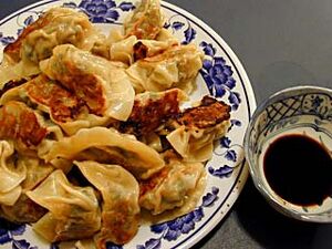Jiaozi (الصينية المبسطة: 饺子; الصينية التقليدية: 餃子; پن‌ين: jiǎo zi; [tɕjɑ̀ʊ.tsɨ] ( استمع)) or gyoza are a type of Chinese dumpling. Jiaozi typically consist of a ground meat or vegetable filling wrapped into a thinly rolled piece of dough, which is then sealed by pressing the edges together. Jiaozi can be boiled (水餃; shuǐjiǎo), steamed (蒸餃; zhēngjiǎo), pan-fried (煎餃; jiānjiǎo), deep-fried (炸餃; zhàjiǎo), or baked (烤餃; kǎojiǎo), and are traditionally served with a black vinegar and sesame oil dip. They can also be served in a soup (湯餃; tāngjiǎo). Jiaozi have great cultural significance within China. Jiaozi are one of the major dishes eaten during the Chinese New Year throughout northern China and eaten all year round in the northern provinces. Their resemblance to the gold and silver ingots (sycee) used in Imperial China has meant that they symbolize wealth and good fortune.[1]
