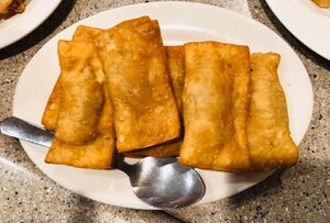 Gau gee (crispy gau gee or kau gee) is a Hawaiian derivative of Cantonese origin brought about during the migration of Chinese in the mid-1800s.[15] The deep-fried dumplings consist of a seasoned ground pork filling in a thick square wonton wrapper that is typically folded half into rectangles or triangles.[16] It is usually accompanied with a condiment of soy sauce mixed with mustard. They are mistakenly called fried wontons in error because the pre-packaged store-bought wrappers are labeled as "wonton wrappers".[17]