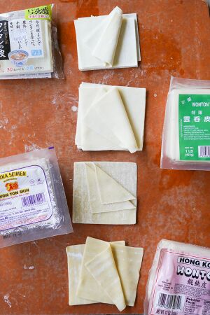 various wrappers labeled as wonton skins