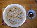 A plate of boiled jiaozi with dipping sauce
