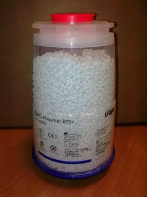 During the administration of general anaesthesia, the gases expired by a patient, which contain carbon dioxide, are passed through an anaesthetic machine breathing circuit filled with soda lime granules.[1] Medical-grade soda lime includes an indicating dye that changes color when the soda lime reaches its carbon dioxide absorbing capacity.