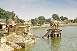 - Gadsisar Lake – Excavated in 1367 by Rawal Gadsi Singh, it is a scenic rainwater lake surrounded by the small temples and shrines of Amar Sagar. Earlier, this lake was used to be the main water source of Jaisalmer. Due to an increased water demand for agriculture, the lake is increasingly threatened to dry out.[6]