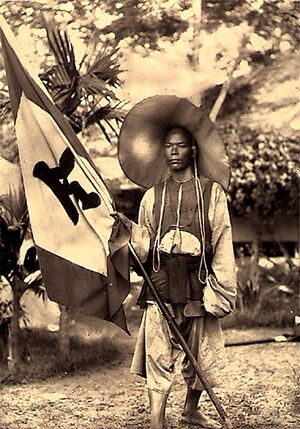 In 1857, Liu Yongfu, a Hakka soldier of fortune, commanded a group of about 200 men within a larger Highwayman group in Guangxi province headed by Huang Sihong (Chinese: 黃思宏). He allied with the Taiping forces in the region. He defected with his men to the band of Wu Yuanqing (Chinese: 吳元清) under his own black flag. Liu organized a ceremony reminiscent of the tiandihui (天地会) rituals and what became known as the Black Flag Army was born. The "army" operated as an independent unit under Wu Yuanqing and under his son and successor, Wu Yazhong (Chinese: 吳亞終)[1] or Wu Hezhong. Although not part of the Taiping forces, both Wu Yuanqing and Wu Yazhong laid claim to be Taiping "princes".[بحاجة لمصدر]