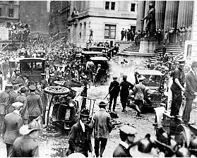 بني عام 1914، 23 وال ستريت، الشهير "بالركن" و"بيت مورگان"، والذي كان المقر المصرفي الرئيسي لأهم مؤسسة في المالية الأمريكية. في مساء 16 سبتمبر 1920، فجر أناركي قنبلة أمام البنك، مما تسبب في مقتل 38 وإصابة 400 شخص. قبل فترة قصيرة من تفجير القنبلة، وضع مجهول ملاحظة تحذيرية في صندوق البريد بركن سدار ستريت وبرودواي. يقول التحذير: "تذكروا أنن لن نتحلى بمزيد من التسامح. اطلقوا سراح السجناء السياسيين أو سيكون موتاً أكيداً لكم جميعأً. المقاتلين الأناركيين الأمريكيين." في الوقت الذي كثرت فيه النظريات حول من وراء تفجير وال ستريت ولماذا قاموا بذلك، بعد عشرين عاماً من التحقيقات أغلق مكتبة التحقيقات الفدرالية ملفات القضية التي بقيت منذ 1940 دون العثور على الجناة.