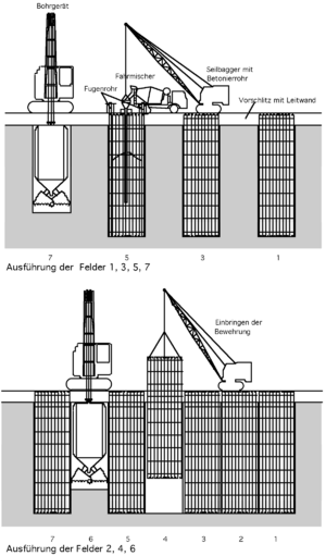 A slurry wall is a civil engineering technique used to build reinforced concrete walls in areas of soft earth close to open water, or with a high groundwater table.[1] This technique is typically used to build diaphragm (water-blocking) walls surrounding tunnels and open cuts, and to lay foundations. Slurry walls are a "well-established" technology but the decision to use slurry walls for a certain project requires geophysical and other engineering studies to develop a plan appropriate for the needs of that specific location. Slurry walls may need to be used in conjunction with other methods to meet project objectives.[2]