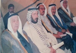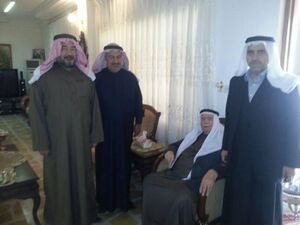 من اليمين الشيخ احسان علي حسون اغا و الشيخ خالد الحاج امين العلي و الشيخ برع الثويني و الشيخ حاتم الحاج امين العلي و الشيخ يونس يحيى اغا امير قبيلة الحياليين ومن الخلف الشيخ عمر يحيى اغا حفيد الشيخ يونس اغا