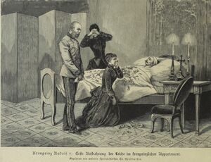 Ferenczy entered the room again to find Elisabeth distraught and weeping uncontrollably. The Emperor appeared outside her apartments and was forced to wait there with Nopcsa, who was controlling himself only with great effort. The Empress broke the news to her husband in private.