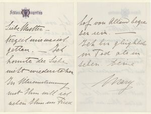 In July 2015, the Austrian National Library issued copies of Vetsera's letters of farewell to her mother and other family members.[13] These letters, previously believed to be lost or destroyed, were found in a safe deposit box in an Austrian bank, where they had been deposited in 1926. The letters—written in Mayerling shortly before the deaths—state clearly and unambiguously that Vetsera was preparing to die by suicide alongside Rudolf: