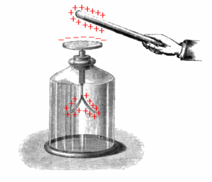 عرض الحث، في عقد 1870. The positive terminal of an electrostatic machine is placed near the brass cylinder, causing the left side to acquire a positive charge and the right to acquire a negative charge. The small pith ball electroscopes hanging from the bottom show that the charge is concentrated at the ends.