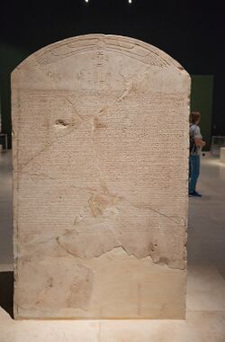 في عام 2001 تم عثور بعثة آثار مصرية على الحجر في منطقة المحاجر الأثرية في منطقة الخازندارية بمحافظة سوهاج بالصعيد. وهو عبارة عن لوحة حجرية تشبه حجر رشيد . ويبلغ طولها 220 سنتيمترا وعرضها 170 سنتيمترا, وتتكون من 21 سطرا مكتوبا بالهيروغليفية و17 سطرا بالهيراطيقية المشتقة منها. وتحتوي اللوحة علي المرسوم الملكي ل بطليموس الثالث (250 ق.م.). ويتضمن معلومات عن الصراعات بين حكام سوريا الأغريق وقتها. واللوحة يعلوها قرص الشمس المجنح، وأسفله الإلهان مخبت وواجبت على هيئة ثعباني كوبرا, يرتدي الأول تاج الوجه القبلي والثاني تاج الوجه البحري, وأسفلهما الإلهة إيزيس والإله أوزوريس وإبنهما حورس. حبث يقوم الإله (مين) إله الإقليم بتقديم بطليموس الثالث وزوجته إلى ثالوث الآلهة. والكتابة علي اللوحة باللغتين الهيروغليفية والهيراطيقية وفي أسفلها كتب : ستستكمل باليونانية. مثلما اتبع في حجر رشيد.