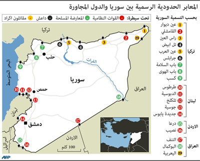 سوريا لها حدود برية مع كل من لبنان، إسرائيل، الأردن، العراق، وتركيا. ولها حدود بحرية اقتصادية مع قبرص.