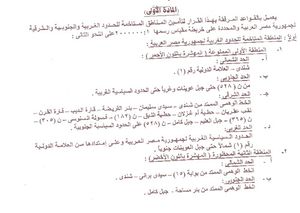 ثالثا: المنطقة المتاخمة للحدود الشرقية لجمهورية مصر العربية بالخريطة المرفقة بهذا القرار من العلامة الدولية رقم (1) حتى طابا بعمق (5) كم من الحدود السياسية الشرقية لجمهورية مصر العربية كالآتي: