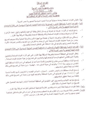1- يحظر التواجد في المنطقة المحددة بالخريطة المرفقة بهذا القرار على غير أفراد القوات المسلحة والعاملين بالدولة الذين تقتضي أعمالهم الرسمية تواجدهم فيها والحائزين على تصريح من هيئة عمليات القوات المسلحة.