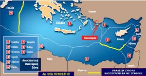 المناطق الاقتصادية الخالصة في شرق البحر المتوسط حسب الحكومة اليونانية. وتوضح الخريطة أن الحدود القبرصية مع كل من مصر وإسرائيل لم تستقر بعد، بالرغم من ترسيمها.