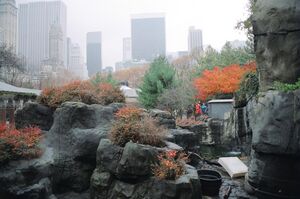 To the west of the garden is the "Temperate Territory", a landscaped series of paths surrounding a lake.[4] It hosts animals such as red pandas, white-naped cranes, snow monkeys, and snow leopards.[9][10] A snow leopard exhibit in the Temperate Territory opened in June 2009.[12] The Temperate Territory is located on the site of the 1934 zoo's cafeteria.[10]