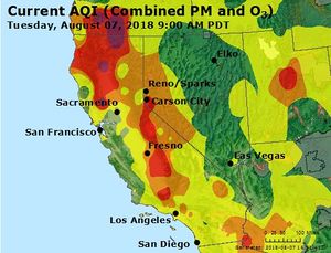 صورة ستالية لحرائق الغابات في شمال كاليفورنيا وجنوب أوريگون يوم 1 أغسطس 2018؛ يظهر الدخان متجاه شمالاً فوق نـِڤادا، أوريگون، واشنطن وأيداهو. | |||||||||||||||