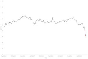 حركة أسعار WTI من 2019. اللون الأحمر يوضح تغير أسعار النفط في يوم واحد، في 9 مارس 2019.