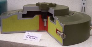 ينفجر عندما تدهسه الدبابة أو أية مركبة ثقيلة أخرى (أعلاه)، ينفجر اللغم المدفون قريبًا من السطح نتيجة لضغط المركبة. تدمر دبابات العدو والمركبات الأخرى. هذه الألغام أكبر من الألغام المضادة للأفراد. تنفجر أغلب أنواع الألغام المضادة للدبابات ـ فقط ـ عندما يتحرك فوقها وزن يزيد على حوالي 150كجم. يستطيع الجنود السير بأمان على هذه الألغام ولكنها تدمر الشاحنات والمركبات الخفيفة التدريع وتتلف ـ على الأقل ـ الجنازير المعدنية التي تتحرك عليها الدبابات.