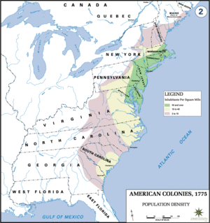 2. ^ In this article, inhabitants of the thirteen colonies that supported the American Revolution are primarily referred to as "Americans", with occasional references to "Patriots", "Whigs", "Rebels" or "Revolutionaries". Colonists who supported the British in opposing the Revolution are referred to as "Loyalists" or "Tories". The geographical area of the thirteen colonies is often referred to simply as "America".