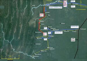 The Paraguayan commander-in-chief, Estigarribia, decided to launch a final assault on Villa Montes. On 7 February 1935, around 5,000 Paraguayans attacked the heavily fortified Bolivian lines near Villa Montes with the aim of capturing the oilfields at Nancarainza, but they were beaten back by the Bolivian First Cavalry Division. The Paraguayans lost 350 men and were forced to withdraw north toward Boyuibé. Estigarribia claimed that the defeat was largely because of the mountainous terrain in which his forces were not used to fighting.[77] On 6 March, Estigarribia again focused all his efforts on the Bolivian oilfields, this time at Camiri, 130 km north of Villa Montes. The commander of the Paraguayan 3rd Corps, General Franco, found a gap between the Bolivian 1st and 18th Infantry regiments and ordered his troops to attack through it, but they became stuck in a salient with no hope of further progress. The Bolivian Sixth Cavalry forced the hasty retreat of Franco's troops to avoid being cut off. The Paraguayans lost 84 troops who were taken prisoner, and more than 500 dead were left behind. The Bolivians lost almost 200 men, but unlike their exhausted enemies, they could afford a long battle of attrition.[78] On 15 April, the Paraguayans punched through the Bolivian lines on the Parapetí River and took over the city of Charagua. The Bolivian command launched a counteroffensive, which forced the Paraguayans back. Although the Bolivians' plan fell short of its target of encircling an entire enemy division, they managed to take 475 prisoners on 25 April. On 4 June 1935, a Bolivian regiment was defeated and forced to surrender at Ingavi, in the northern front, after a last attempt had been made to reach the Paraguay River.[79] On 12 June, the day that the ceasefire agreement was signed, Paraguayan troops were entrenched only 15 km away from the Bolivian oil fields in Cordillera Province.