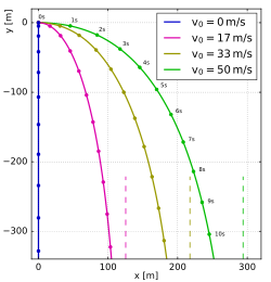 Near-horizontal motion: In case the motion is almost horizontal, , such as a flying bullet, the vertical velocity component has very little influence on the horizontal motion. In this case:[8]