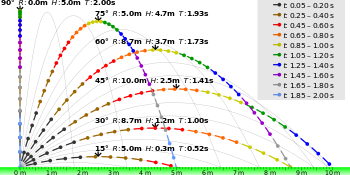 Trajectories of projectiles launched at different elevation angles but the same speed of 10 m/s in a vacuum and uniform downward gravity field of 10 m/s2. Points are at 0.05 s intervals and length of their tails is linearly proportional to their speed. t = time from launch, T = time of flight, R = range and H = highest point of trajectory (indicated with arrows).