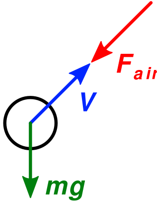 Air resistance creates a force that (for symmetric projectiles) is always directed against the direction of motion in the surrounding medium and has a magnitude that depends on the absolute speed: . The speed-dependence of the friction force is linear () at very low speeds (Stokes drag) and quadratic () at larger speeds (Newton drag).[5] The transition between these behaviours is determined by the Reynolds number, which depends on speed, object size and kinematic viscosity of the medium. For Reynolds numbers below about 1000, the dependence is linear, above it becomes quadratic. In air, which has a kinematic viscosity around , this means that the drag force becomes quadratic in v when the product of speed and diameter is more than about , which is typically the case for projectiles.