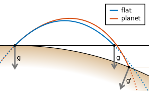 Projectile trajectory around a planet, compared to the motion in a uniform field