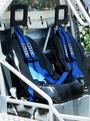 Five-point harnesses are typically found in child safety seats and in racing cars. The lap portion is connected to a belt between the legs and there are two shoulder belts, making a total of five points of attachment to the seat. A 4-point harness is similar, but without the strap between the legs, while a 6-point harness has two belts between the legs. In NASCAR, the 6-point harness became popular after the death of Dale Earnhardt, who was wearing a five-point harness when he suffered his fatal crash. As it was first thought that his belt had broken, and broke his neck at impact, some teams ordered a six-point harness in response.[20]
