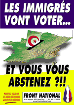 A National Front political poster. The text reads, "Immigrants are going to vote...and you're abstaining?!!". Voting rights in France are restricted to those who possess French nationality (as well as EU citizens living in France for local and European polls).