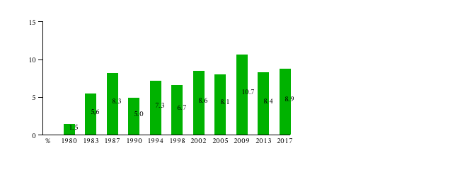 1990[a] | 2.589.912 | 5.6 (#5) | 2.347.407 | 5.0 (#4) | 8 / 662