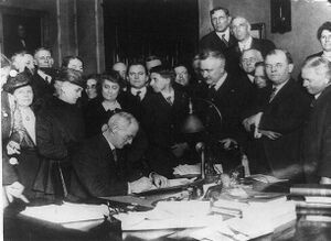 Naval Captain William H. Stayton was a prominent figure in the anti-prohibition fight, founding the Association Against the Prohibition Amendment in 1918. The AAPA was the largest of the nearly forty organizations that fought to end Prohibition.[107] Economic urgency played a large part in accelerating the advocacy for repeal.[108] The number of conservatives who pushed for prohibition in the beginning decreased. Many farmers who fought for prohibition now fought for repeal because of the negative effects it had on the agriculture business.[109] Prior to the 1920 implementation of the Volstead Act, approximately 14% of federal, state, and local tax revenues were derived from alcohol commerce. When the Great Depression hit and tax revenues plunged, the governments needed this revenue stream.[110] Millions could be made by taxing beer. There was controversy on whether the repeal should be a state or nationwide decision.[109] On March 22, 1933, President Franklin Roosevelt signed an amendment to the Volstead Act, known as the Cullen–Harrison Act, allowing the manufacture and sale of 3.2% beer (3.2% alcohol by weight, approximately 4% alcohol by volume) and light wines. The Volstead Act previously defined an intoxicating beverage as one with greater than 0.5% alcohol.[18] Upon signing the Cullen–Harrison Act, Roosevelt remarked: "I think this would be a good time for a beer."[111] According to a 2017 study in the journal Public Choice, representatives from traditional beer-producing states, as well as Democratic politicians, were most in favor of the bill, but politicians from many Southern states were most strongly opposed to the legislation.[112]