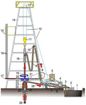 The rotary system of drilling was in general use in Texas in the early 1900s. It is a modification of one invented by Fauvelle in 1845, and used in the early years of the oil industry in some of the oil-producing countries in Europe. Originally pressurized water was used instead of mud, and was almost useless in hard rock before the diamond cutting bit.[2] The main breakthrough for rotary drilling came in 1901, when Anthony Francis Lucas combined the use of a steam-driven rig and of mud instead of water in the Spindletop discovery well.[3]