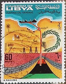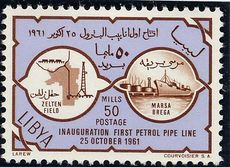 طابع بريدي ليبي، اصدار 1961، بمناسة افتتاح أول أنابيب البترول بين حقل زلطن ومرسى البريقة. | |