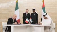 محمد بن زايد ورئيس الوزراء الإيطالي يشهدان توقيع اتفاقيات تبادل حقول نفط وغاز بين أدنوك وإيني، مارس 2018.