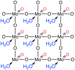 Solid forms of molybdic acid are coordination polymers. The monohydrate MoO3·H2O consists of layers of octahedrally coordinated MoO5·(H2O) units where 4 vertices are shared.[3] The dihydrate (image shown above) has the same layer structure with the "extra" H2O molecule intercalated between the layers.[4]