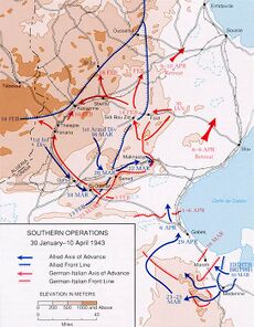 During the first half of January, Anderson had with mixed results kept constant pressure through limited attacks and reconnaissance in strength.[39] Arnim did the same and on 18 January, launched Operation Eilbote I ("Courier I").[40] Elements of the 10th Panzer and 334th Infantry divisions attacked from Pont du Fahs to create more space in front of the Superga Division and forestall an Allied thrust east to the coast at Enfidaville, to cut Rommel's line of communication.[41] The westward thrust against the right wing of the British V Corps at Bou Arada had little success but further south his attack against French positions around the "hinge" of the Western and Eastern Dorsals succeeded, advancing 56 km (35 mi) south to Ousseltia and 40 km (25 mi) south-west to Robaa. The poorly equipped defenders resisted well but were overwhelmed and the equivalent of seven infantry battalions were cut off in the mountains.[42] Anderson sent the 36th Brigade to Robaa and requested Lloyd Fredendall to send Combat Command B from 1st Armored Division to Ousseltia, to come under Juin's orders on arrival. Fierce fighting lasted until 23 January but the front was stabilised.[39]