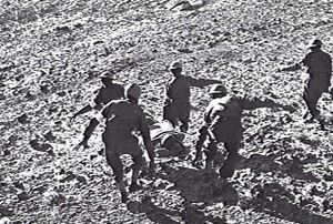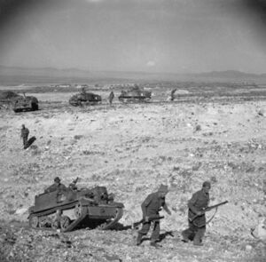 Fighting lasted until 5 March and in terrible weather conditions the operation was called off by Arnim.[73] The failure had cost the Axis grievous losses in infantry as well as tanks, particularly the loss of many of the heavy Tiger Tanks.[72] Ochsenkopf was to be the last major Axis offensive by the 5th Panzer Army.[74] On 25 March, Alexander ordered a counter-attack on the V Corps front and on 28 March, Anderson attacked with the 46th Infantry Division, with the 138th Infantry Brigade, 128th Infantry Brigade in reserve and reinforced by the 36th Infantry Brigade, 1st Parachute Brigade and French units including a tabor of specialist mountain Goumiers, the artillery of two divisions plus more from army resources. In four days, it succeeded in recapturing all lost ground and took 850 German and Italian prisoners.[70] On 7 April, Anderson tasked the 78th Infantry Division with clearing the Béja-Medjez road. Supported by artillery and close air support, they methodically advanced 16 km (10 mi) through difficult mountain terrain over the next ten days, clearing a front 16 km (10 mi) wide. The 4th Infantry Division joined the fighting, taking position on the left of the 78th Division and pushing toward Sidi Nsir.[75]