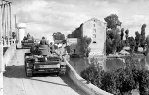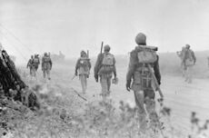 The northern attack did not take place because torrential rain had slowed the build-up. In the south 11th Brigade were halted by stiff resistance at Medjez. Blade Force passed through Sidi Nsir to reach the Chouigui Pass, north of Terbourba part of B Squadron Stuart's from Blade Force infiltrated behind Axis lines to the newly activated airbase at Djedeida in the afternoon and destroyed more than 20 Axis planes but lacking infantry support, withdrew to Chouigui. The understrength tank Squadrons and three M3 GMC French 75s were to hold the pass. A mixed unit of Panzer III and Panzer IVs and a small Italian scouting Force, around 15 tanks all told. Frontal attacks by the GMCs and Stuarts were ineffective losing 12 tanks, but allowed a rear attack by B Squadron firing into the weaker rear armour of the German tanks. The German commander, believing he had encountered a much stronger force, retreated.[27] Blade Force's attack caught Nehring by surprise and he decided to withdraw from Medjez and strengthen Djedeida, only 30 km (19 mi) from Tunis.[28] The 36th Brigade's delayed attack began on 26 November but they were ambushed with the leading battalion taking 149 casualties.[29] Further attacks were driven back from cleverly planned interlocking defences. 1 Commando landed 23 km (14 mi) west of Bizerte on 30 November to outflank the Jefna position, but failed and rejoined 36th Brigade by 3 December.[23] The position remained in German hands until the last days of fighting in Tunisia the following spring.[30]