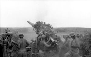 On 19 February 1943, Rommel, having now been given formal control of the 10th and 21st Panzer Divisions, the Afrika Korps battlegroup as well as General Messe's forces on the Mareth defences (renamed Italian First Army),[48] launched what would become the Battle of Kasserine Pass. Hoping to take the inexperienced defenders by surprise, he sent the light armour of the 3rd Reconnaissance Battalion racing into the pass. Colonel Alexander Stark's Stark Force, a brigade group made up of US and French units, was responsible for the defence of the pass.[48] It had not had time to organise properly but was able to direct heavy artillery fire from the surrounding heights which brought the leading mechanised units of the Afrika Korps batlegroup to a halt.[49] Before they could continue, infantry had to be sent up into the high ground seeking to eliminate the artillery threat. A battlegroup under Hans-Georg Hildebrand including tanks from 21st Panzer were advancing north from Sbeitla toward the Sbiba Gap. In front of the hills east of Sbiba they were brought to a halt by 1st Guards Brigade and 18th Regimental Combat Team which had strong field and anti-tank artillery support and were joined by two infantry regiments from 34th Infantry Division.[50]