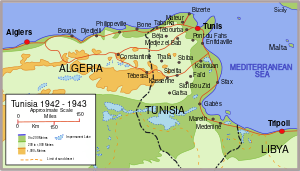 Because of the nearness of Sicily to Tunisia, the Allies expected that the Axis would move to occupy the country as soon as they heard of the Torch landings.[6] To forestall this, it would be necessary to occupy Tunisia as quickly as possible after the landings were made. However, there was a limit to how far east the Torch landings could be made because of the increasing proximity of Axis airfields in Sicily and Sardinia which at the end of October held 298 German and 574 Italian aircraft.[7] Algiers was accordingly chosen for the most easterly landings. This would ensure the success of the initial landings in spite of uncertainty as to how the incumbent French forces would react. Once Algiers was secured, a small force, the Eastern Task Force, would be projected as quickly as possible into Tunisia in a race to occupy Tunis, some 800 km (500 mi) distant along poor roads in difficult terrain during the winter rainy season, before the Axis could organise.[8]