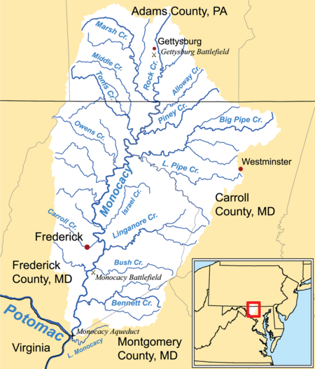 حملة گتيسبرگ was a military invasion of Pennsylvania by the main Confederate army under General Robert E. Lee in summer 1863. It was the first time during the war the Confederate Army attempted a full-scale invasion of a free state. The Union won a decisive victory at Gettysburg, July 1–3, with heavy casualties on both sides. Lee managed to escape back to Virginia with most of his army. It was a turning point in the American Civil War, with Lee increasingly pushed back toward Richmond until his surrender in April 1865. The Union Army of the Potomac was commanded by Maj. Gen. Joseph Hooker and then (from June 28) by Maj. Gen. George G. Meade.