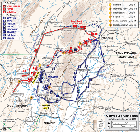 The Confederate retreat to Virginia was plagued by bad weather, difficult roads, and numerous skirmishes with Union cavalry. However, Meade's army did not maneuver aggressively enough to prevent Lee from crossing the Potomac to safety on the night of July 13–14.