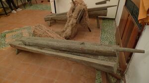 At the hemp house, the hemp fiber would arrive in large square bales, already macerated and dry, and it would be forcefully slammed against a wooden pole, equipped with metal rods, to complete the breakage of the stalk.[52] The remaining woody fragments would then be removed using comb-like tools of different shapes for both coarser and finer combing, in preparation for the spinning phase.[52][53] While using scutching tools with ever-finer teeth, the finest of which could have a teeth spacing as small as 1 mm (0.04 in), the artisans would gradually separate the different fibers based on their qualities, including their robustness and color.[54] The spinning mechanism consisted in a large rotating wooden wheel, placed vertically and firmly fixed to the ground, equipped with laterally protruding rods that supported a winding rope connecting the wheel to several interchangeable wooden cylinders of different dimensions, depending on the final size of the rope to be produced, which were located a few meters away.[52][53] The rotating wheel would make such cylinders spin, and they could be used to either twist a twine (with a single cylinder), or intertwine three or four strings (with multiple cylinders) to produce different types of rope.[52][53][54]