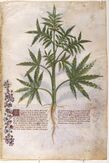 In Italia, different parts of the hemp plants were used for various culinary purposes, in particular Pliny mentions hemp seeds being stored in pots for later use and lasting for as much as one year, while the stalks and branches were used as vegetables.[18] Most notably, a recipe for cannabis-based food intended to be consumed at wedding receptions can be found in the De re culinaria, a collection of Roman cookery recipes thought to have been compiled in the 5th century A.D., and whose authorship is unclear.[30] In terms of the contemporary beliefs on cannabis plants and the effects of their personal use, according to Pliny, wild hemp first grew in woods and had darker and rougher leaves, while its seeds were said to cause impotence.[19] The juice derived from it was used to drive out worms and other creatures that could enter the ears, although it would cause headache as a side effect, and it was said to be so potent that it was able to coagulate water when it was poured into it.[19] Furthermore, when the hemp juice was mixed with water and then drunk by beasts of burden, it was said to be able to regulate their bowels.[19]