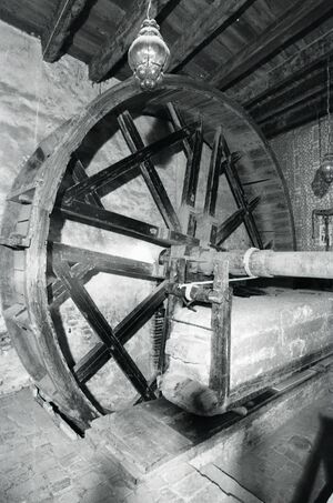 Several other tools were used to keep the rope always tightly stretched, while also sustaining its weight along the ropewalk; to avoid hand contact with the rope during twisting; and to keep it constantly lubricated, thus preventing any damage from friction-related heat.[46][52][53][54] Afterwards, the rope was soaked overnight, since the water would cause the twisted fibers to stick together, which would therefore increase the compactness of the rope.[52][53][54] As a final touch, an iron mesh would subsequently be used to rub the rope, to remove the last few remaining streaks, while a stretch of coarse rope would be rolled up and run around the rope for a final smoothing and polishing.[52][53][54] The produced ropes would then be safely stored, thus creating strategic stockpiles that would allow the Republic to remain independent from external suppliers during wartime.[44] These stockpiles were overseen by three magistrates, known as the Visdomini alla Tana, who were elected by the Major Council, and one of the required checks was that the ropes produced for vessels had to be made from exactly 1,098 twisted hemp strings.[46] When needed, the rope would be taken out of storage through dedicated holes, and cut at the required size, rather than already being produced at standardized lengths, while the fiber of any leftover would be repurposed.[44][46]