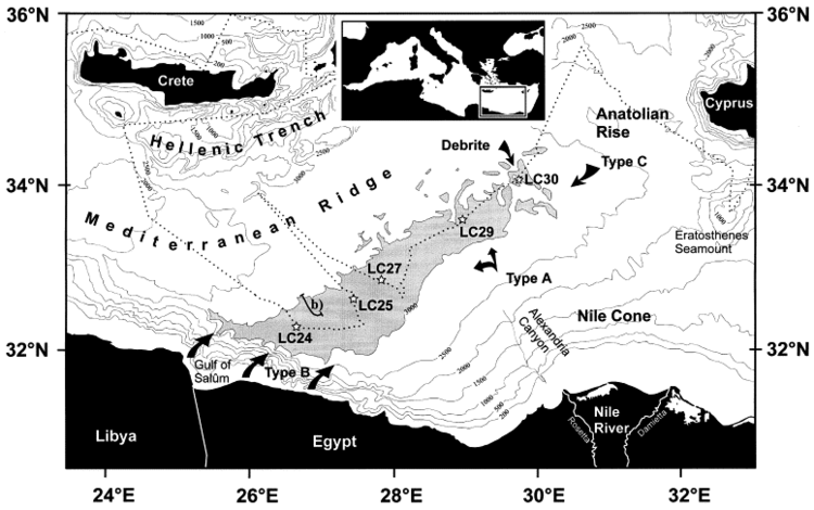 ويحيط بحوض هيرودوت الأقسام التالية من البحر المتوسط بدءاً من الجنوب الغربي، عكس عقارب الساعة: خليج السلوم، الساحل الشمالي (مصر)، ثم أخدود الإسكندرية، ثم جبل إراتوستينس الغاطس، ثم إلى الشمال الشرقي منه: سهل هيرودوت السحيق والمرتفع الأناضولي ومرتفع فلورنس؛ ثم إلى الشمال: نتوء المتوسط؛ ثم إلى الشمال الغربي: الخندق الهليني الذي يفصله عن جزيرة كريت.