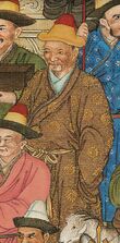 In 1632, the Gelug Yellow Hat sect in Qinghai was being repressed by the Khalkha Choghtu Khong Tayiji, so they invited Güshi Khan to come and deal with him. In 1636, Güshi led 10,000 Oirats in an invasion of Qinghai which resulted in the defeat of a 30,000 strong enemy army and the death of Choghtu. He then entered Central Tibet, where he received from the 5th Dalai Lama the title of Bstan-'dzin Choskyi Rgyal-po (the Dharma King Who Upholds the Religion). He then claimed the title of Khan, the first non-Genghisid Mongol to do so, and summoned the Oirats to completely conquer Tibet, creating the Khoshut Khanate. Among those involved was Kharkhul's son, Erdeni Batur, who was granted the title of Khong Tayiji, married the khan's daughter Amin Dara, and sent back to establish the Dzungar Khanate on the upper Emil River south of the Tarbagatai Mountains.[16] Batur returned to Dzungaria with the title Erdeni (given by the Dalai Lama) and much booty. During his reign he made three expeditions against the Kazakhs. The conflicts by the Dzungars are remembered in a Kazakh ballad Elim-ai.[17] The Dzungars also went to war against the Kyrgyz, Tajiks, and Uzbeks when they invaded deep into Central Asia to Yasi (Turkestan) and Tashkent in 1643.[18]