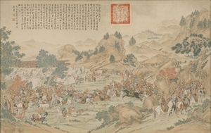 "The Victory of Khorgos". The partisans of Amursana were defeated in 1758 by Prince Cäbdan-jab. Painting by Jean Denis Attiret.[44]